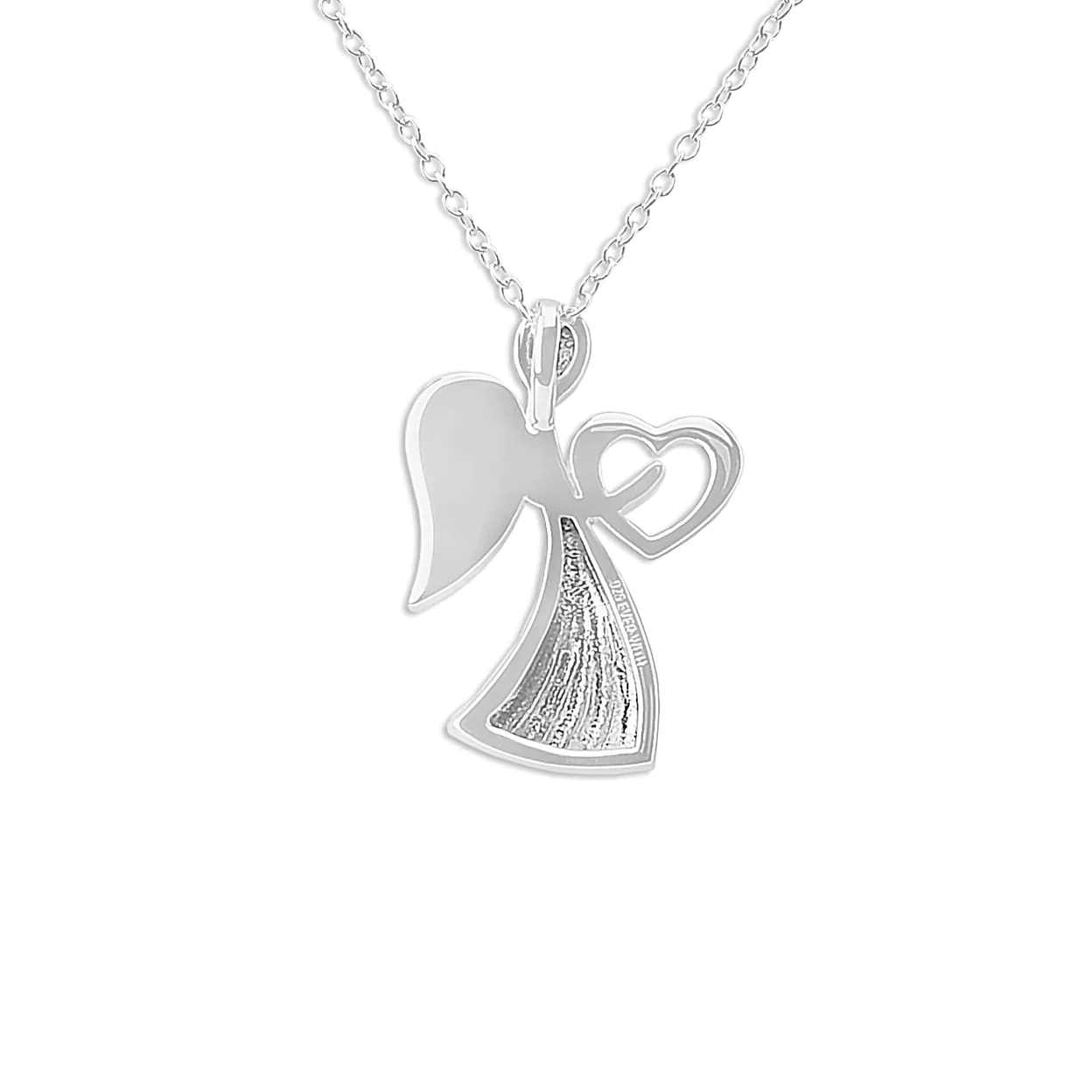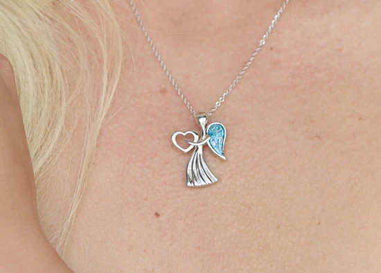 Nasz naszyjnik memorialny składa się z dwóch elementów: łańcuszka o długości 40 cm oraz wisiorka w kształcie aniołka noszącego serce, którego skrzydło jest wypełniona żywicą, w której możemy zatopić przesłany przez Ciebie materiał, np. prochy, sierść lub pukiel włosów.