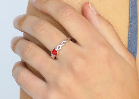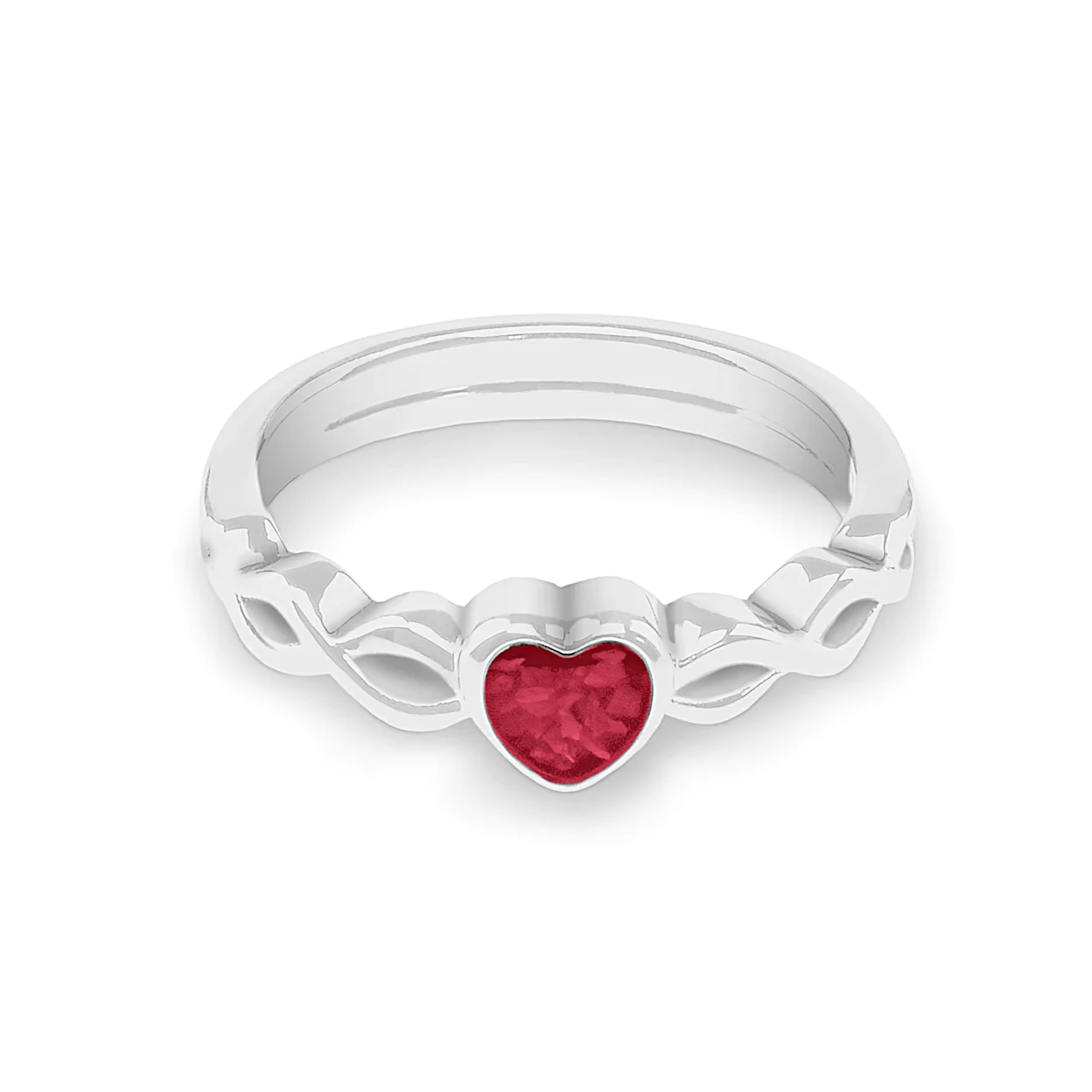Nasz pierścionek memorialny jest prosty i subtelny, przez co jest bardzo uniwersalny. Będzie stanowił dyskretne uzupełnienie biżuteryjne na co dzień. Ma prostą obręcz, na której znajduje się oprawa w kształcie serca wypełniona żywicą, w którą możemy zatopić przesłany przez Ciebie materiał, np. prochy, sierść lub pukiel włosów.