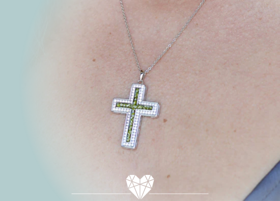 Nasz Naszyjnik Memorialny CROSS składa się z dwóch elementów: łańcuszka o długości 40 cm oraz wisiorka w kształcie krzyża z żywicą, w której możemy zatopić przesłany przez Ciebie materiał, np. prochy, sierść lub pukiel włosów. Dodatkowo wokół całej oprawy z żywicą umieściliśmy drobne, błyszczące kryształki.