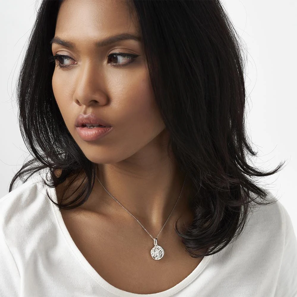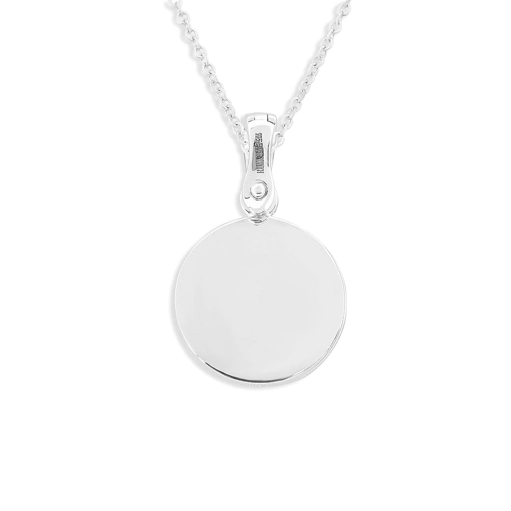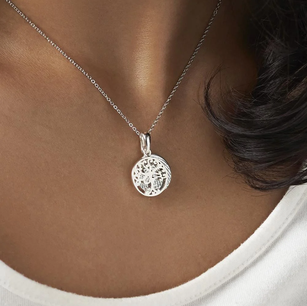 Naszyjnik jest starannie wykonany ze srebra próby 925 oraz pokryty warstwą rodu, która pozwala utrzymać jej powierzchnię jasną i błyszczącą.