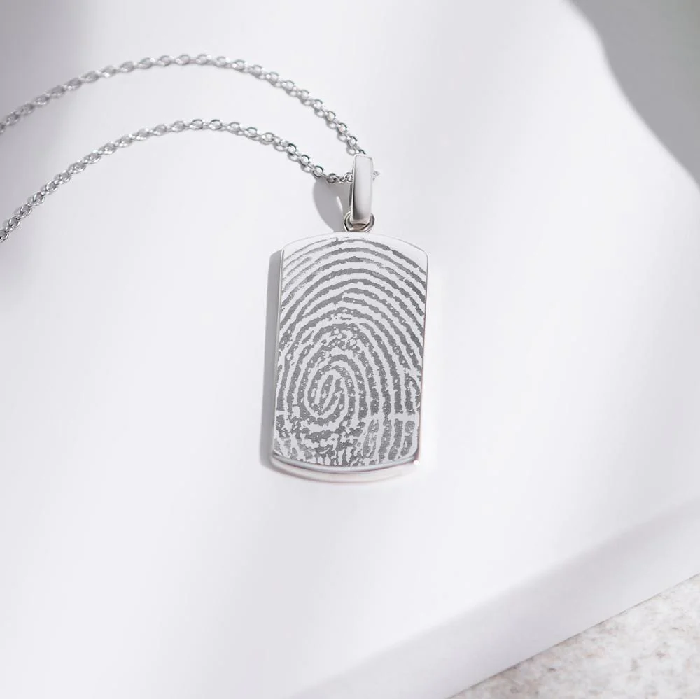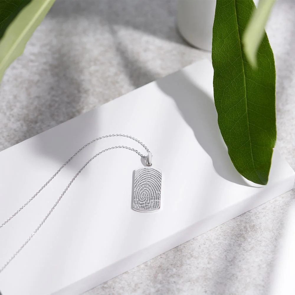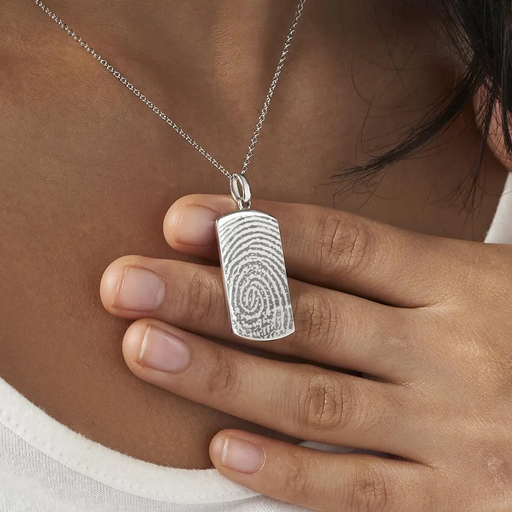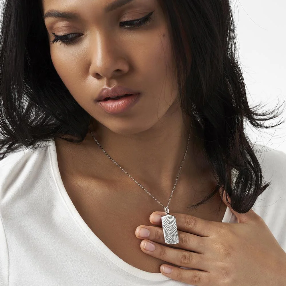 Nasz Naszyjnik Memorialny ZAWIESZKA jest prostym, ale niezwykle efektownym elementem biżuteryjnym. Składa się z 2 elementów: łańcuszka o długości 40 cm (z regulacją) oraz wisiorka w kształcie prostokątnej płytki, na którym można wygrawerować odcisk linii papilarnych. W tym celu konieczne jest odpowiednie pobranie odcisku.