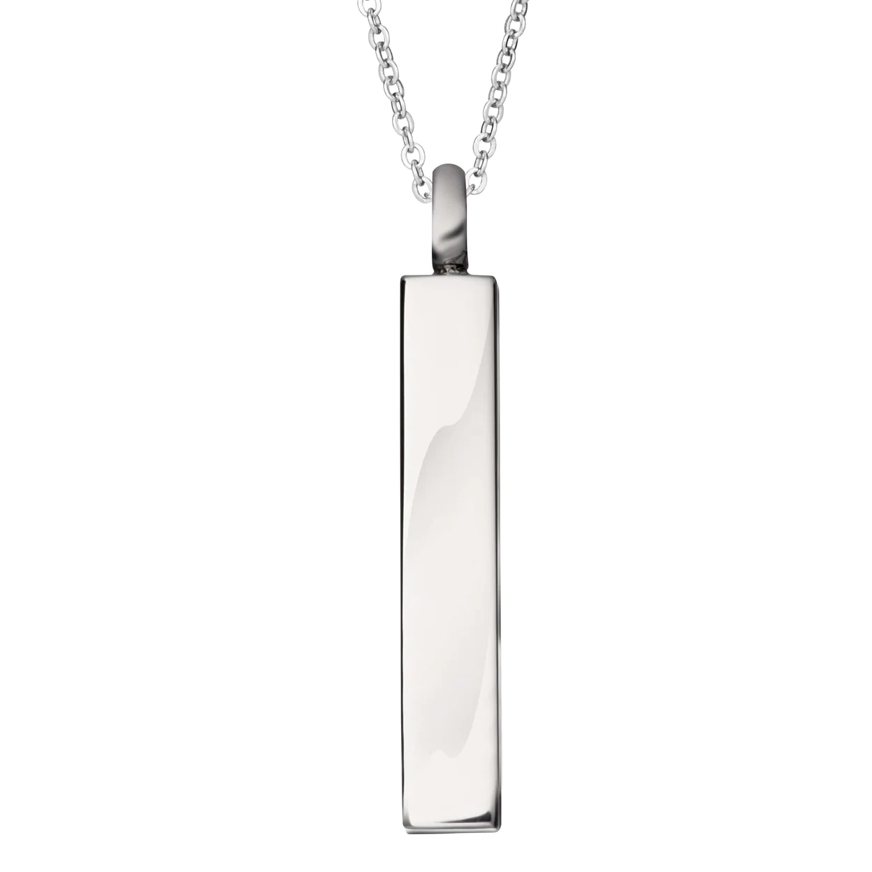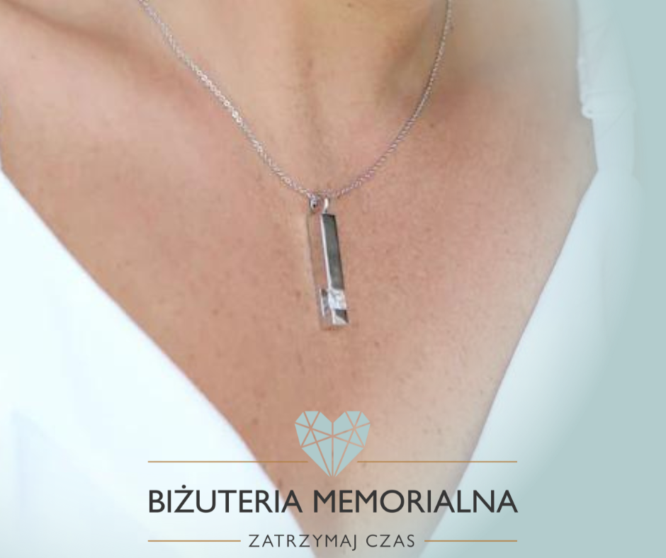 Nasz Naszyjnik Memorialny BAR składa się z dwóch elementów: łańcuszka o długości 40 cm oraz wisiorka w kształcie prostego słupka, w którego dolnej części umieściliśmy błyszczący kryształek. Wisiorek pełni funkcję osobistego relikwiarza, który napełniasz samodzielnie.