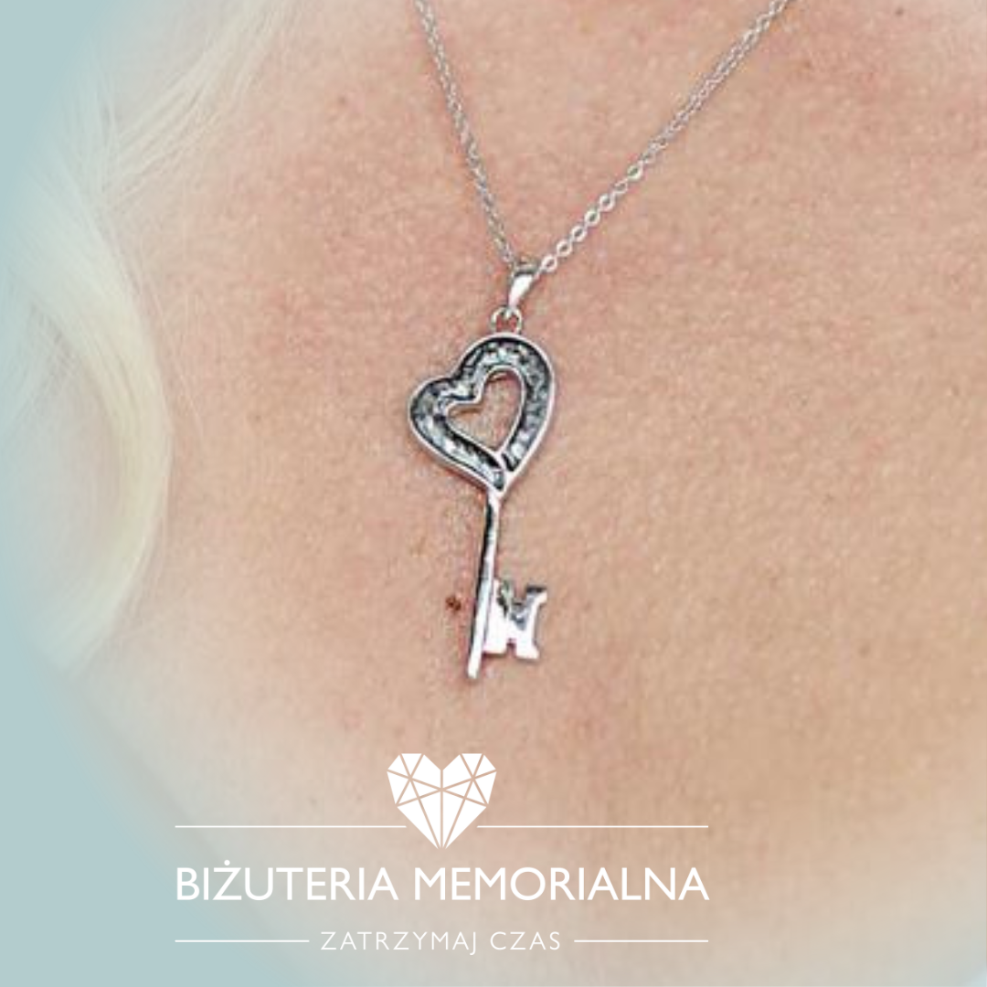 Nasz Naszyjnik Memorialny z kolekcji KEY składa się z dwóch elementów: łańcuszka o długości 40 cm oraz wisiorka w kształcie klucza, którego górna część jest wypełniona żywicą. Możemy w niej zatopić przesłany przez Ciebie materiał, np. prochy, sierść lub pukiel włosów.