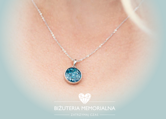 Nasz KLASYCZNY Naszyjnik Memorialny składa się z dwóch elementów: łańcuszka o długości 40 cm oraz prostego wisiorka o okrągłym kształcie z żywicą, w której możemy zatopić przesłany przez Ciebie materiał, np. prochy, sierść lub pukiel włosów.