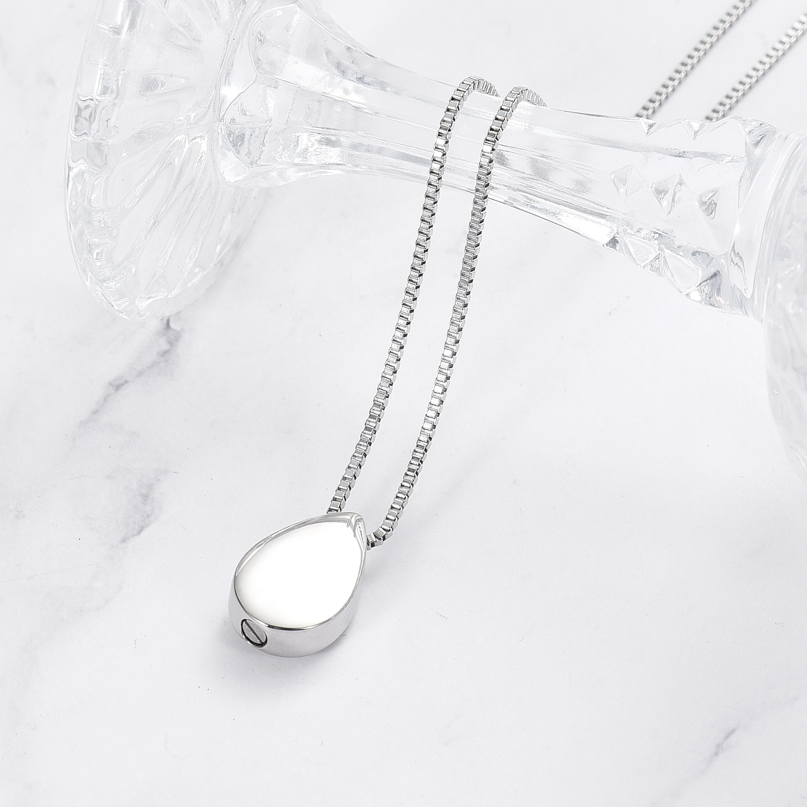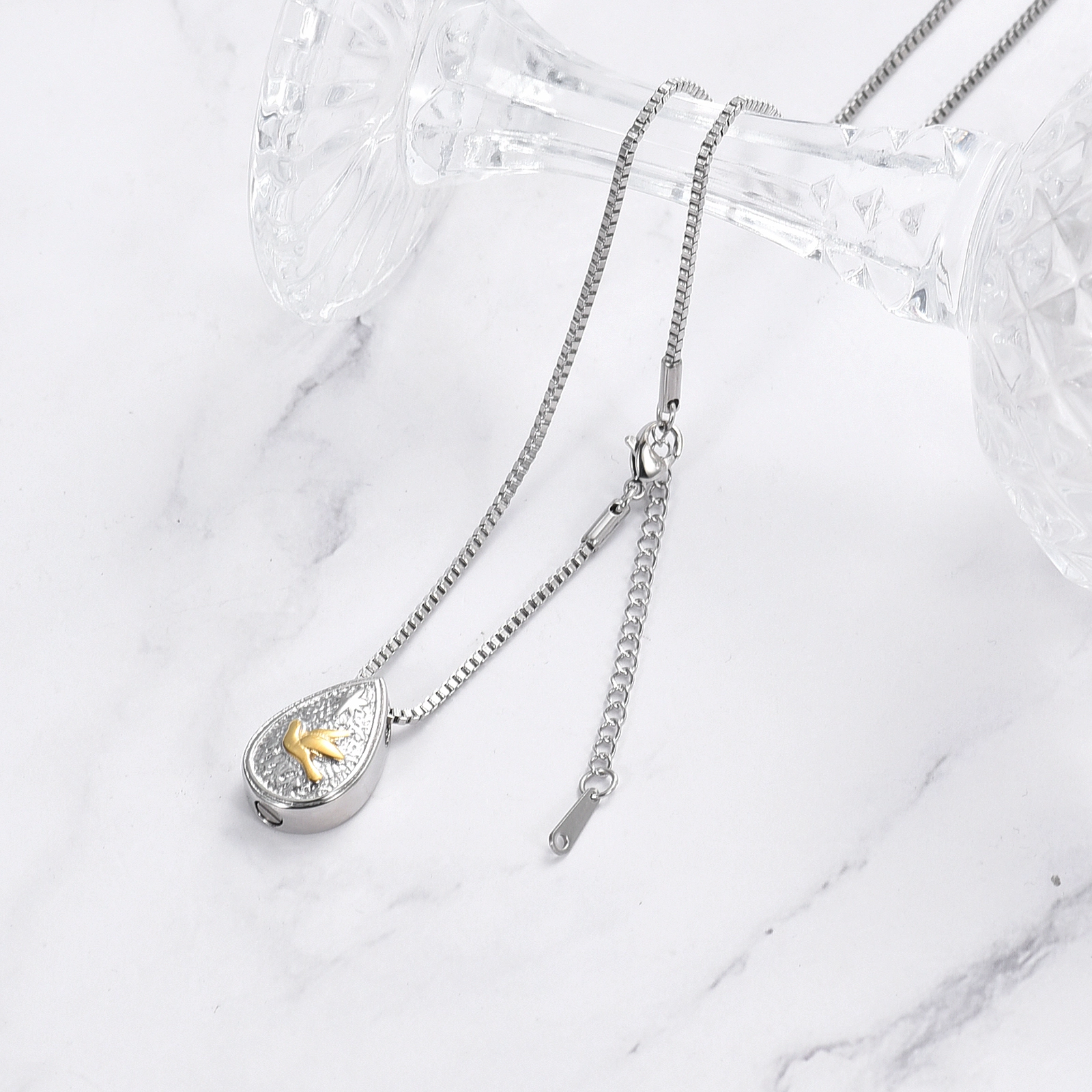 Naszyjnik relikwiarz -ŁEZKA GOLD BIRD do samodzielnego napełnienia, składający się z wisiorka widocznego na zdjęciu oraz łańcuszka o splocie żyłkowym, o długości 50 cm.