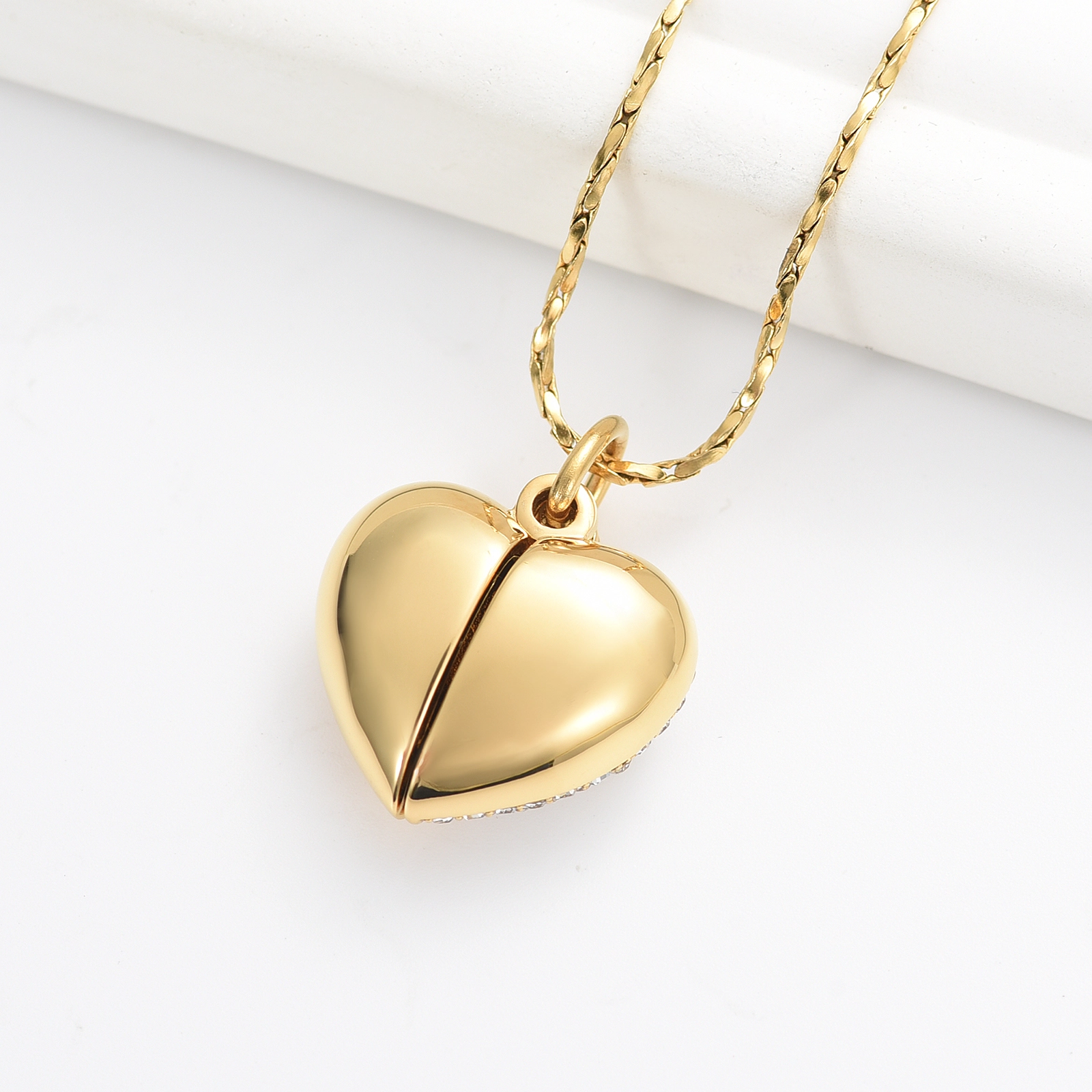 Naszyjnik relikwiarz - OTWARTE SERCE GOLD do samodzielnego napełnienia, składający się z wisiorka widocznego na zdjęciu oraz łańcuszka o splocie żyłkowym, o długości 50 cm.