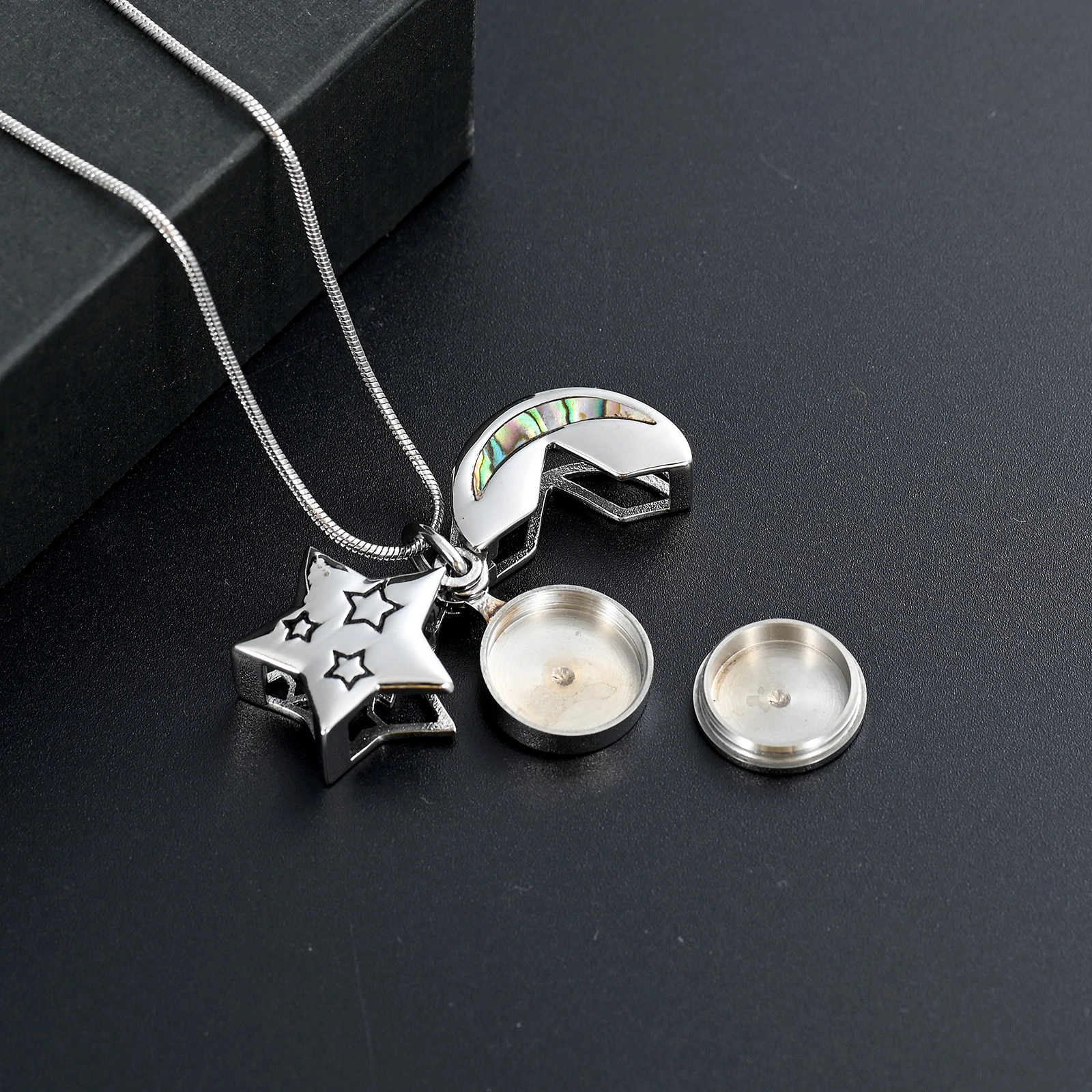 Naszyjnik relikwiarz - PERŁOWE NIEBO do samodzielnego napełnienia, składający się z wisiorka widocznego na zdjęciu oraz łańcuszka o splocie żyłkowym, o długości 50 cm.