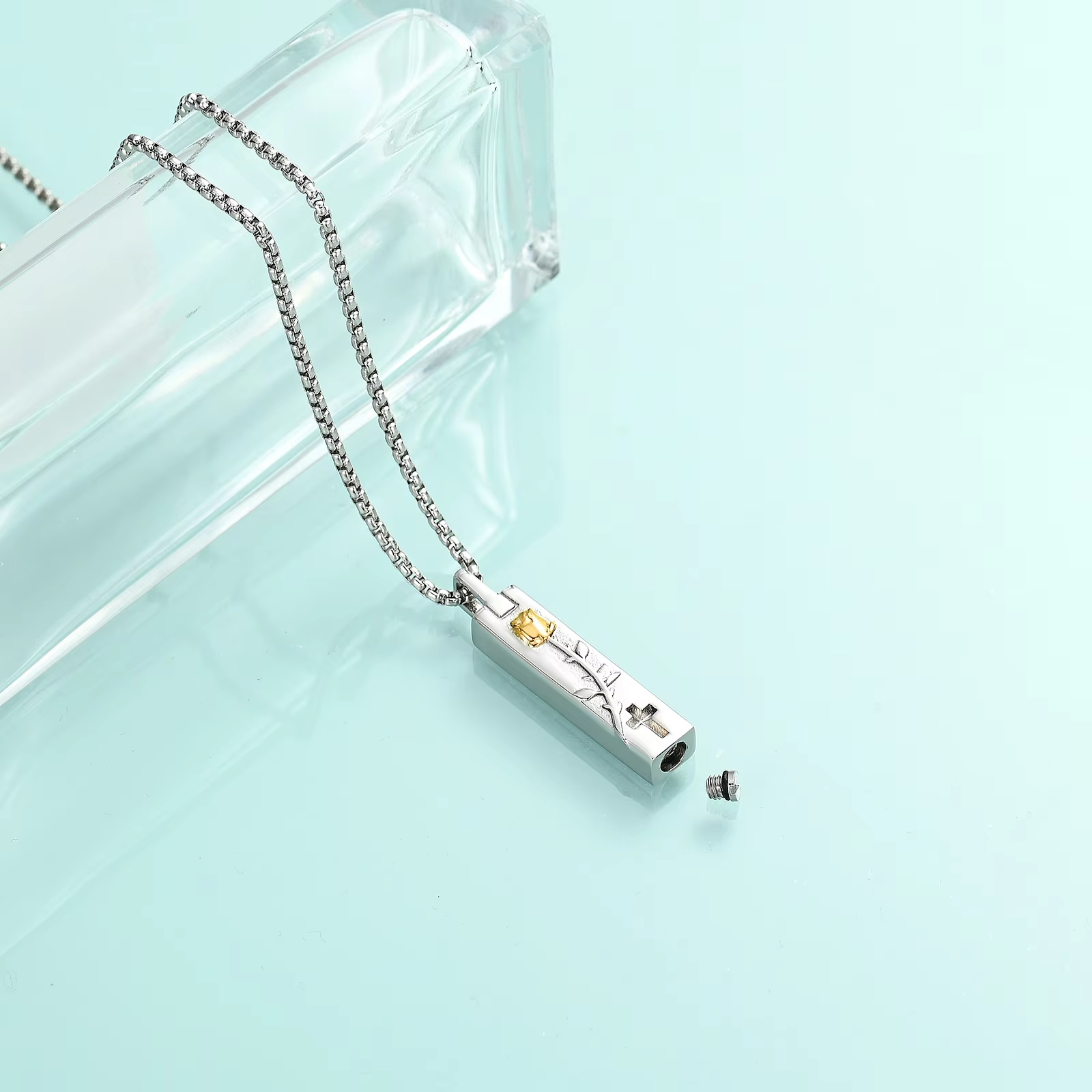 Naszyjnik relikwiarz - SZTABKA Z RÓŻĄ do samodzielnego napełnienia, składający się z wisiorka widocznego na zdjęciu oraz łańcuszka o splocie żyłkowym o długości 50 cm.
