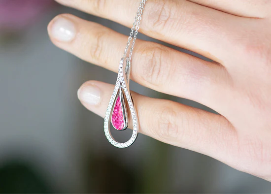 Ten wyjątkowy Naszyjnik Memorialny - TEARDROP w kształcie kropli łzy został wykonany z kryształków i osadzony w szlachetnym kruszcu. Cenną zawartość zamkniętą z miłością w żywicy przechowuje się w centralnej oprawce, która jest przymocowana do zewnętrznego naszyjnika i może swobodnie poruszać się. Do wyboru jest aż dwanaście kolorów żywicy, a na życzenie można dodać pył diamentowy, który nada delikatnego, subtelnie mieniącego się blasku w jasnym świetle słonecznym. Będzie to wyjątkowa i spersonalizowana biżuteria, która z pewnością będzie niezwykłą pamiątką dla każdego, kto chce uczcić pamięć swoich bliskich.